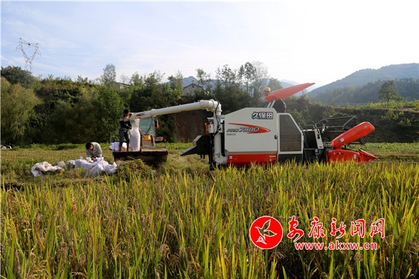 待粮舱装满,郑书鹏按动电钮,合作社的工人迅速拿着编织袋对准出粮口,金黄的稻子从舱内倾斜而出,“哗啦啦”翻滚进口袋,不一会儿袋子便鼓了起来,看着饱满的谷粒,郑书鹏忍不住捏起几粒搓了皮塞到嘴里咀嚼起来。“今年合作社买了一台收割机,小半天不到几块不成型的小田已经全部收割完。以前靠人工收割,全村出动要忙活一个周才能收完,现在有了收割机,还能为周边市县的种植户提供服务。”良田村合作社负责人郑书鹏喜滋滋地说。