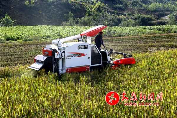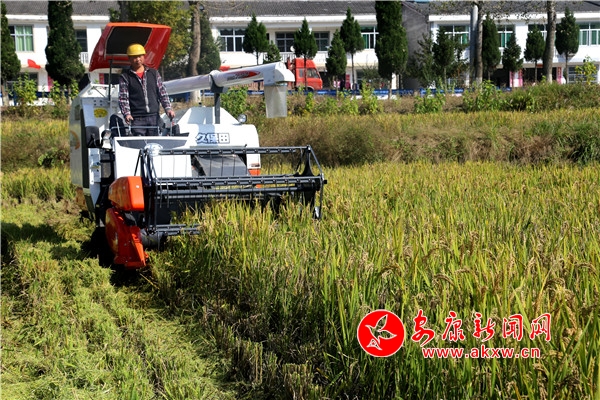 稻田里,收割机正在纵横驰骋,所到之处稻穗被“大口吞进”,金灿灿的谷粒欢快地蹦进储存舱里,伴随收割机尾部吐出的碎末,秸秆瞬间被粉碎还田。