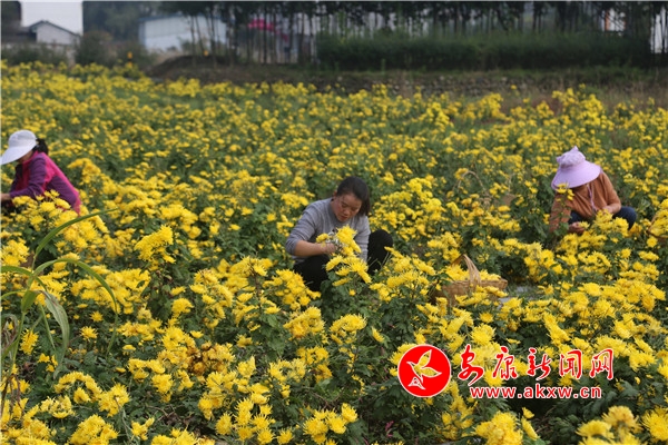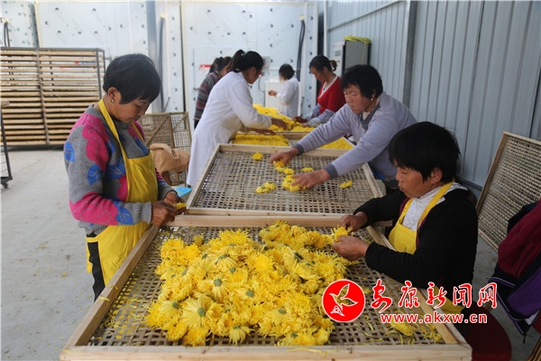 五爱村群山环绕,空气清新,良好的自然生态环境成为金丝皇菊孕育生长的绝佳之地。最近几天正值金丝皇菊的盛花期,菊园内,人们趁着好天气忙着采菊,眉眼里尽显丰收的喜悦。合作社里,10余名工人正在挑拣、摆放刚采回来的菊花。负责人谭小燕说,这些形态娇媚,金黄艳丽的金丝皇菊经过72小时的恒温烘烤,便可成为一款天然健康的饮品:金丝皇菊茶。