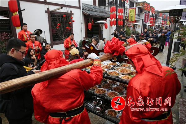 红灯笼高挂的长街上,64张四方八仙桌列如方阵,整齐有序,翘首等待来客的入座;热气腾腾的后厨正紧罗密布的张罗着庖汤席,鲜香的食材、火热的灶台、精致的摆盘,28道家乡美食应接不暇的登场上桌,说菜人口吐莲花,菜越说越香;酒歌高亢,越喝越暖;竞拳激烈,秦巴汉子划出豪迈风采,作坊小镇声动震天,香飘十里。