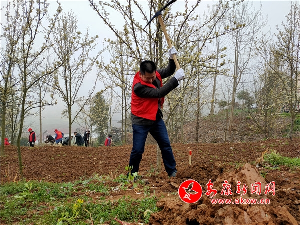 活动现场,全局干部3人一组,相互协作,挥锹铲土、挖坑扶苗、培土浇水,热火朝天。“这个车厘子每亩种植密度是74株,株行距是3米乘3米,要挖一个长宽深是60厘米的坑,你们最好是两三个人一组,培土要一垫二提三埋四踩,每个动作到位才能提高树苗成活率”技术人员耐心地给大家讲解着种树要领。经过一上午的辛苦劳作,136株车厘子果树“安家落户”。