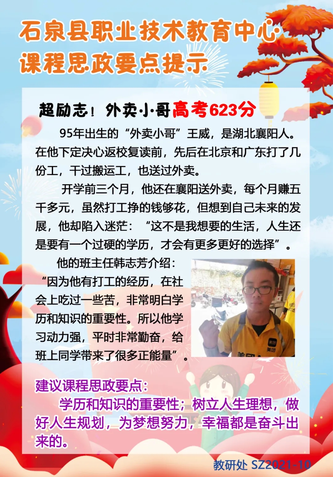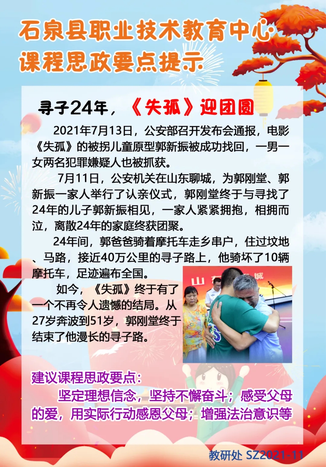 “寻子24年,《失孤》迎团圆……建议课程思政要点:坚定理想信念,坚持不懈奋斗;感受父母的爱,用实际行动感恩父母等。”这是石泉县职教中心正在教师群内推送《课程思政要点提示》小卡片。