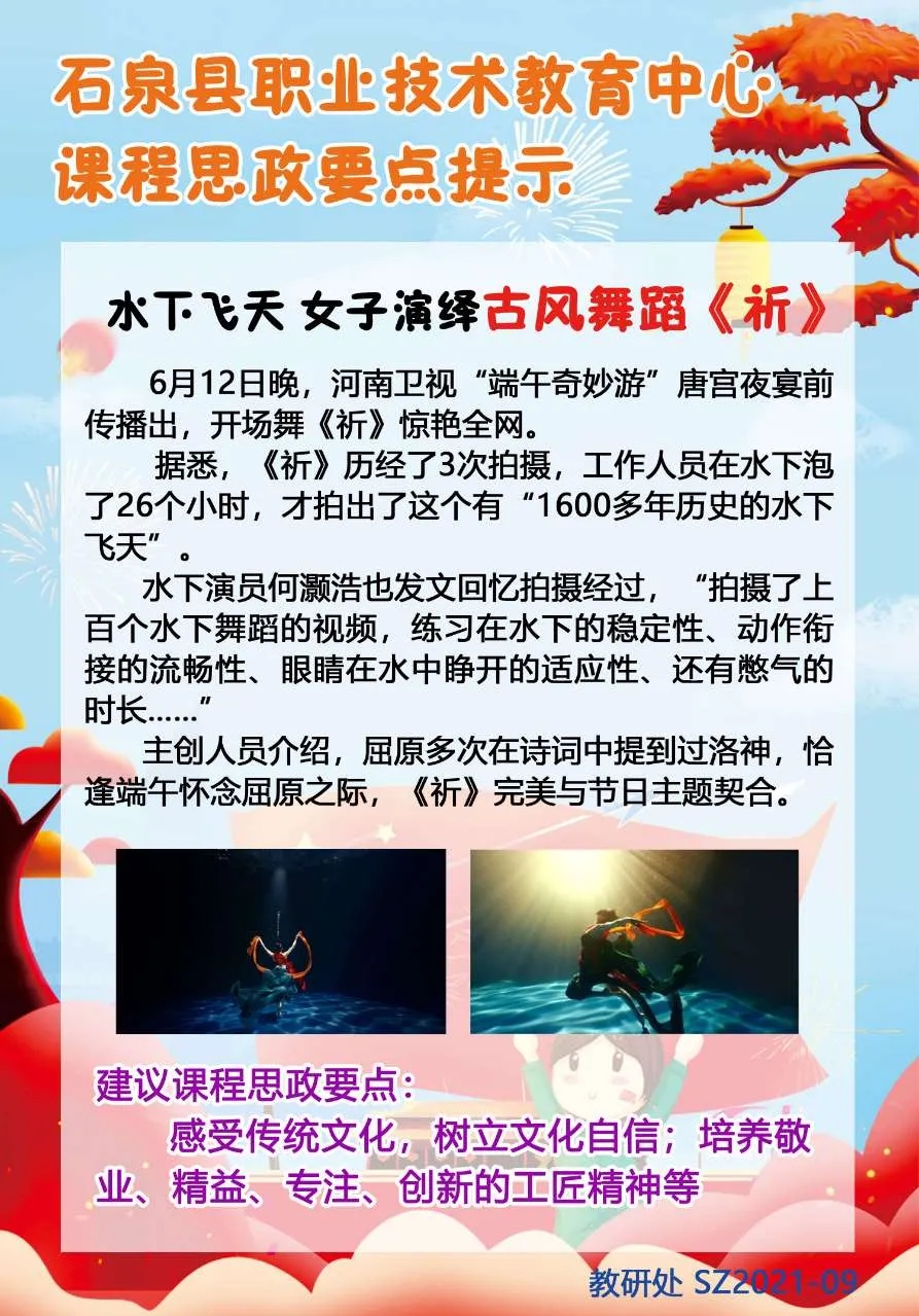 为进一步推动教师在教学中渗透思政教育,提升课程思政的实效性,县职教中心教研处积极搜集具有育人功能的时政新闻,结合中职学生的认知特点,将其整理制作成精美的《课程思政要点提示》小卡片,由思政专业课教师把关后,及时向全体教职工推送。小卡片涵盖家国情怀、政治认同、人文修养和职业素养等思政内容,通过介绍近期热点新闻和提出建议要点,为教师在各学科课程中开展课程思政提供素材和方向。