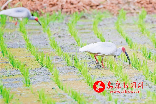 成年朱鹮在草池湾田间觅食