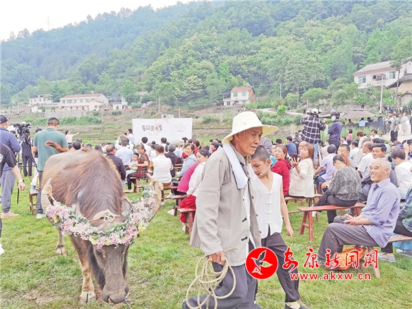 老人孩子牵着装扮一新的耕牛引人围观