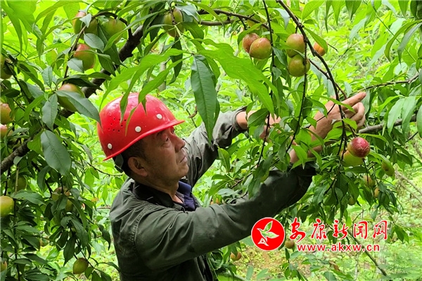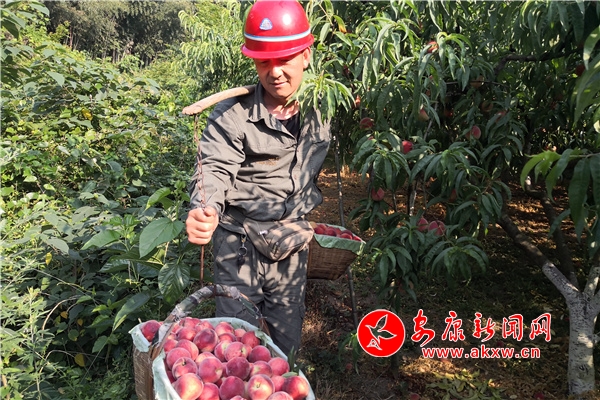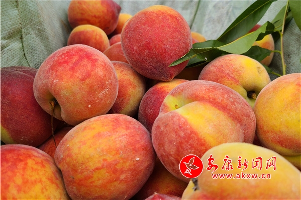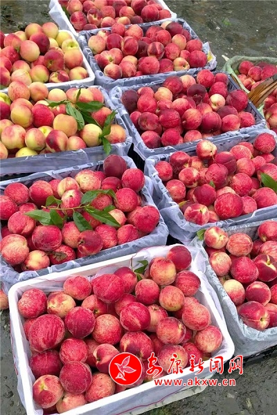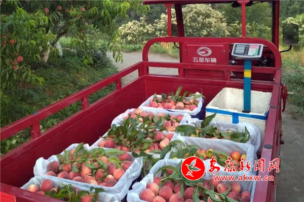 产业大户许国栋的果园里栽种有蜜桃、黄桃、油桃、蟠桃、冬桃等七八个品种桃树。蜜桃和黄桃现已大量上市。果园里工人们正加紧采收桃子,分拣装框,一部分运往附近超市,一部分通过网络订单发往全国各地。高峰时期,许国栋果园一天售出的桃子达4000余斤。