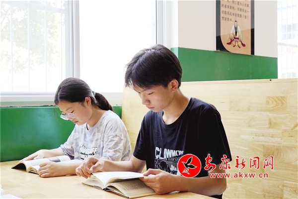 马英琦(右)在石泉中学图书馆看书