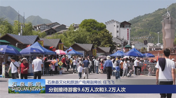 石泉县文化和旅游广电局副局长 任飞飞:全县五一期间,累计接待游客 39.85 万人次,同比去年增长 180%,旅游综合收入 2.19 亿元,同比去年增长145%。其中汉江石泉古城接待游客10.6万人次,后柳水乡、饶峰驿站分别接待游客9.6万人次和3.2万人次,醉美桑海接待游客2.82 万人次。中坝大峡谷接待 1.92 万人次。假日期间,山水体验、休闲观光、亲子研学、民俗文化成为文旅市场选择热点。