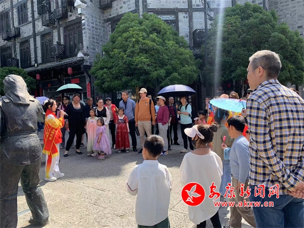 “各位游客大家好,我是自石泉县城关一小的小小讲解员,欢迎大家跟随我的脚步游览石泉秦巴老街”。这五一假日期间从石泉秦巴老街里传来的朗朗童声,来自“小小讲解员·童音话石泉”——石泉县全域旅游红领巾讲解员培训班的小朋友们用稚嫩且熟练的话语、自信的神态向往来游客们介绍了石泉老街东西城门、石泉县衙、禹王宫、江西会馆以及老街上的美食,小小讲解员各个仪态大方、表达清晰、发挥自如,赢得了游客们驻足围观,时不时传来阵阵掌声和夸奖。