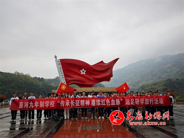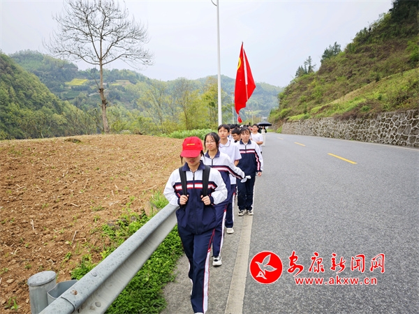活动中,该校师生沿着公路有序行进,途中相互鼓励打气,顺手捡走路边垃圾,用实际行动保护家乡的绿水青山,彰显中学生良好的精神风貌。经过2个小时的徒步行走,师生顺利到达终点喜河镇红色文化广场。