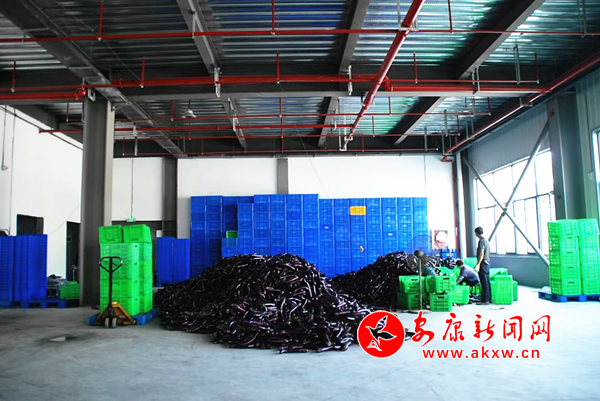 图为丰产期的紫皮长茄被堆放在仓储车间