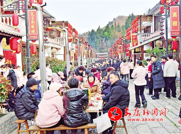 “开席啰……”随着一声锣响,充满仪式感的省级非遗庖汤盛宴正式开始。古色古香的店铺门头挂满红灯笼,石板铺成的长街上,宾客8人一桌围炉而坐,道道美食依次上席,说菜人“口吐莲花”,菜越说越香;酒歌高亢,越喝越暖;猜拳行令,秦巴汉子尽显豪迈风采;作坊小镇高朋满座,满满年味十里香飘。
