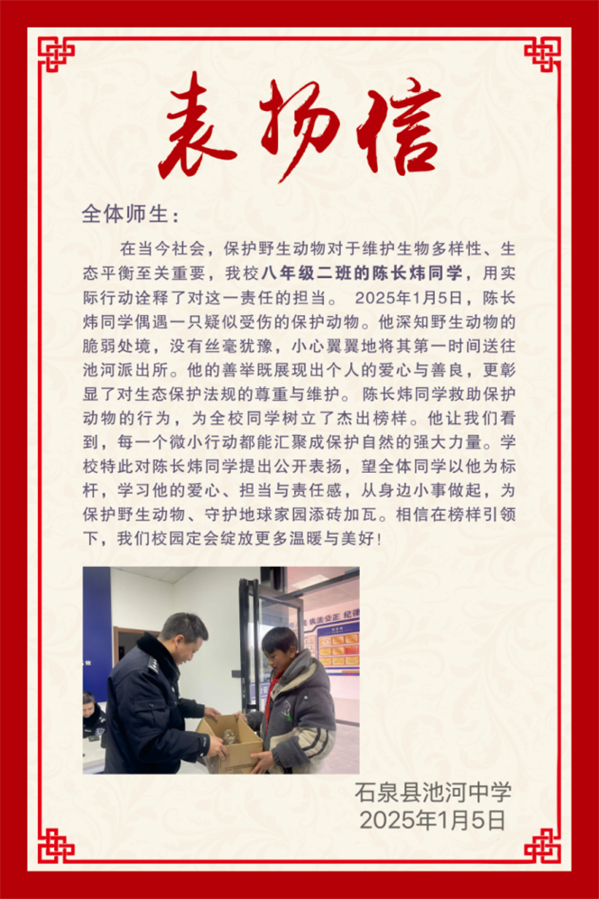 陈长炜的暖心事迹传到学校后,学校发布了表扬信,公开表扬陈长炜同学的爱心善举和保护野生动物的暖心行为。号召全体学生要学习陈长炜的爱心、责任和担当,从小事做起,从自身做起,保护野生动植物,为保护地球家园、尊重生态文明的多样性贡献力量。