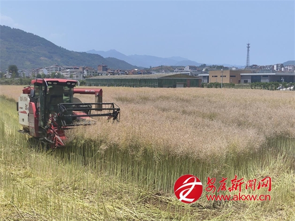 5月19日,石泉县池河镇五爱村油菜种植基地里,大型联合收割机正进行采收作业。池河镇今年种植油菜8600亩,已全部成熟并有序组织抢收。当地大力推广机械化作业,既提升采收效率,又能实现秸秆还田,有效解决焚烧秸秆问题。(通讯员 王朋) Z4e安康新闻网