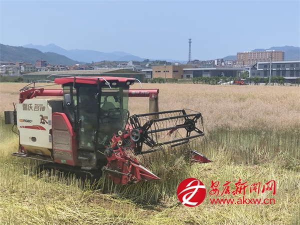 5月19日,石泉县池河镇五爱村油菜种植基地里,大型联合收割机正进行采收作业。池河镇今年种植油菜8600亩,已全部成熟并有序组织抢收。当地大力推广机械化作业,既……