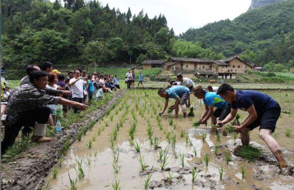 城里人真会玩,来到乡下学插秧
