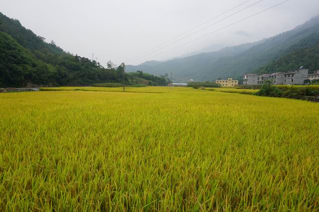 汽车顺着一条蜿蜒曲直的水泥路,沿着西岔河逆流而上,叠嶂滴翠,肥鸭戏水,炊烟应景,四目张望一梯梯、一片片金黄的稻田,收获之悦悠然心底。