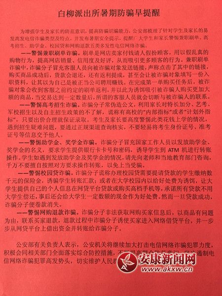 安康新闻网讯(通讯员 康倩)暑假,本是学生放松与家人相聚的温馨时刻,但年年暑假都有很多不法分子,钻了学生涉世未深,轻易相信他人的空子,对学生实施诸如发放助学金、暑期兼职等类型的电信诈骗。对此白柳派出所专门针对此类电信诈骗在辖区进行了广泛宣传,不仅学生需注意,家长更需警惕。