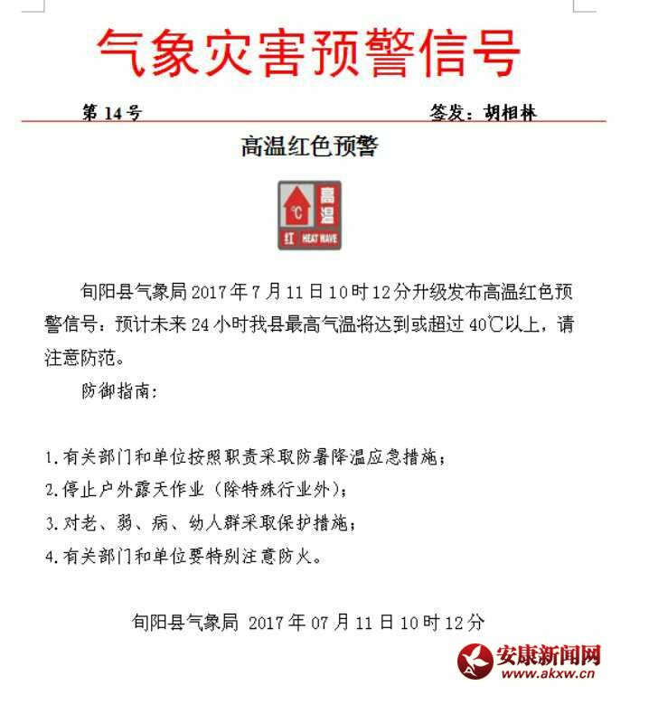 安康新闻网讯(通讯员 钱梦莉)旬阳县气象局2017年7月11日10时12分升级发布高温红色预警信号:预计未来24小时我县最高气温将达到或超过40℃以上,请注意防范。L95安康新闻网