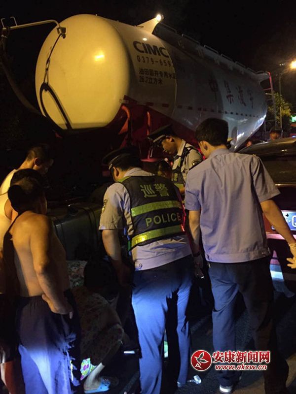 7月21日晚23时许,旬阳县公安局巡警大队康华园巡逻民警接到过路的群众报警,称:城区周家沟附近有交通事故,可能有人受伤。民警立即赶往事发地点,沿途发现交通以堵塞,长长的车队一眼望不到头,赶到事发地点后,发现一油罐车车底躺着两个人,一男一女系夫妻关系,女子的腿部受伤严重,不能移动,当民警赶到现场后,交警以及救护车随后赶到,巡逻民警配合救护人员将躺在油罐车下的两人救出,及时送往医院救治。