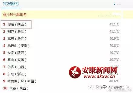 安康新闻网讯(通讯员 梁慧)连日来,“旬阳”牌烤箱火力全开,温度一再飙升,据中央气象台发布的全国气温实况排名中,旬阳县以41.1℃排名全国第一。