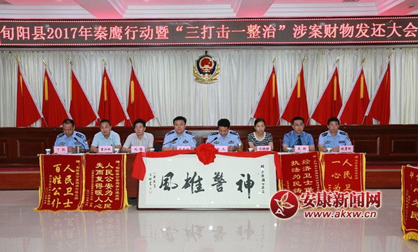 安康新闻网讯(通讯员 祝康 )7月27日,旬阳县公安局举行了2017秦鹰行动暨“三打击一整治”专项斗争涉案财物发还大会。该县副县长张成功出席大会,亲手将该局在专项斗争期间,追缴的总价值103余万元涉案钱款交到受害群众手中。