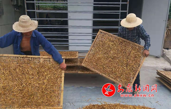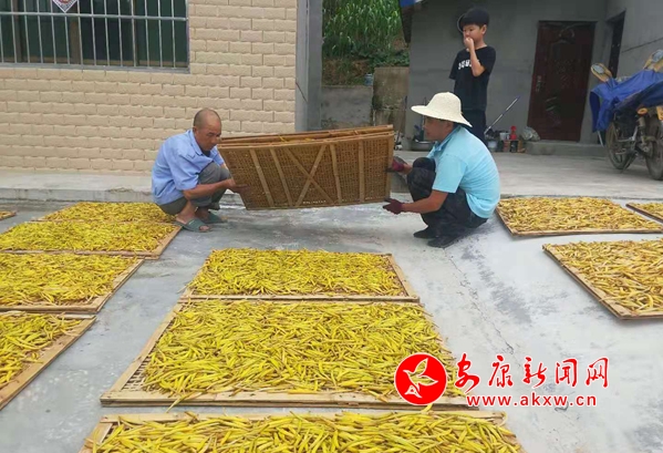当然,要把黄花菜制成成品不单单是采摘回收那么简单,还需要经过杀青、晾晒、烘烤、挑选等多道程序。“现在我们平均每天可以回收新鲜黄花菜四五百斤,制成干黄花后,市场价每斤可以卖到30元左右。”金竹村支部书记、天门山农业专业合作社理事长詹先斌边忙碌边向我们介绍道。三年来,在他和乡亲们的共同努力下,“金竹黄花”在当地的名气越来越响,金竹村天门山农业专业合作社也一步步发展壮大,成长为一家集种植、生产、加工、销售黄花菜为一体的综合性农业专业合作社,詹先斌成为了村里名副其实的致富“领头人”。