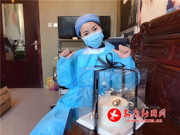 在隔离点临时开辟的狭小工作区,负责人吉品政和同事们买来了生日蛋糕,因陋就简泡了一桶方便牌“长寿面”,为小汪唱起了生日歌。烛光与泪光扑朔、歌声与笑声交融,短暂的热闹打破了隔离点的紧张忙碌。层层的隔离衣下,汗水和泪水交织的小汪,激动地拨通与妈妈的视频电话,把现场“直播”给了家人,让他们放心。