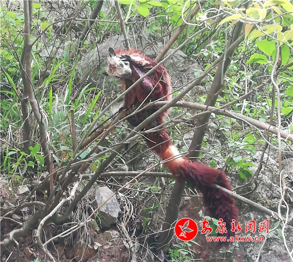 石章明第一时间联系了县林业局,工作人员立即赶到护林站,看见这个小动物全身毛色发亮,棕红色与白色相间,拖着一条酷似松鼠一样的大尾巴,头又圆又小,眼睛大,眼圈赤栗色,体长1米多,尾巴长度超过体长。经过现场查看、图片比对,并和市林业局联系,最终确认这就是国家有益、有重要经济、有科学研究价值的“三有”保护野生动物——飞狐。随即,林业工作人员对这只飞狐进行了全面体检救治。