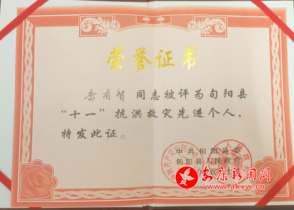 而岳有智也用自己的实际行动真正诠释了军人“退伍不褪色”的内涵,被组织表彰为“抗洪救灾先进个人”。