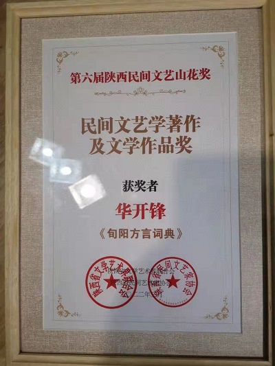 3月3日,第六届“陕西民间文艺山花奖”颁奖典礼在陕歌大剧院隆重举行。旬阳市政协副主席、陕西省特级教师教学名师华开锋编撰的著作《旬阳方言词典》和王智编著的《关中老作坊》两部作品荣获民间文艺学著作及文学作品奖。