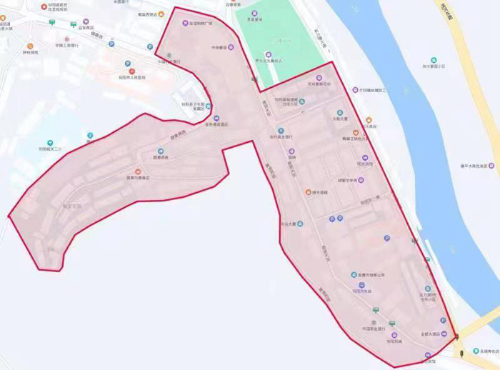 二、城关镇区域:金都酒店--中医院--商贸大街1巷东口--商贸大街4巷东口--祝尔慷广场隔壁家属楼(祝尔慷广场南面)--商贸大街4巷西口--商贸大街1巷西口--南方商城--汽车站--金都酒店所覆盖区域;城关镇财政所--中央都会--外贸家属楼--高家沟(馨安花园小区)--黄虎西路全段(含卫校路全段);丽都口--自强广场--党家坝加油站以北覆盖区域继续落实管控(详见附图),其他区域有序进行正常生产生活,落实常态化疫情防控措施。