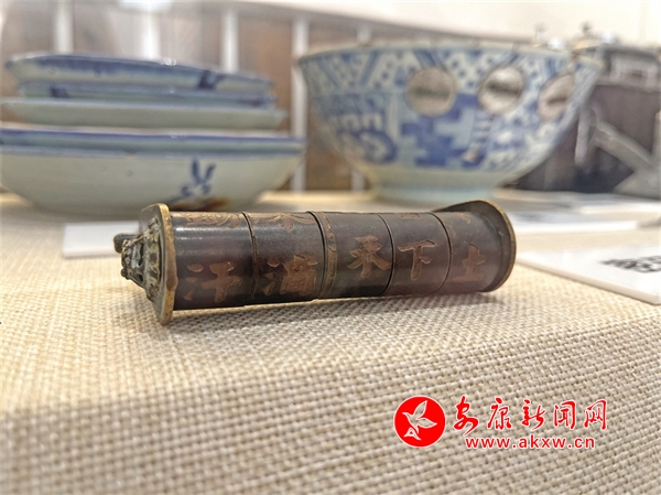转入内间,是镇史溯源板块,大事纪要展板条理清晰,各类农耕用具散布各处。其中一个玻璃展柜格外显眼,展柜中一摞青花瓷碟碗痕迹斑驳,一把藏诗锁静静躺在一旁。只见横式的圆柱体铜锁有5个拨轮,上面共有20个行书汉字,连读起来正是唐诗《悯农》,铜锁表层有重度磨痕,但字迹依旧清晰,锁的两侧均铸成狮子头状。“想打开这把锁先得有文化、会识字,还得知道语句特有的顺序。”据这件铜锁的捐赠者梁延介绍,这把密码锁是原属于金寨一家大户,是祖传的物件儿。