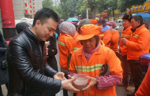 天冷降温,室外寒冷,环卫工人更是辛苦。旬阳南方百货携手旬阳南方商务酒店,在这个寒冷的日子,在这个中国传统的腊八节,为辛劳的城市卫士送上一碗热热的腊八粥……