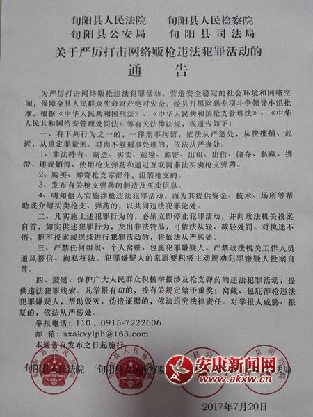 安康新闻网讯(通讯员 祝康)7月20日,旬阳警方联合法、检、司部门共同发布了《关于严厉打击网络贩枪违法犯罪活动的通告》。从该县警方了解到,发布此次《通告》……