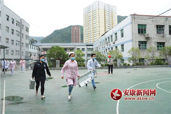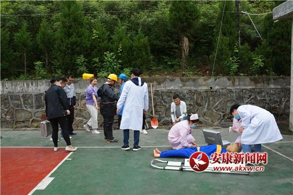 演练模拟事件背景 由于长时间降雨,镇坪县医院篮球场处发生大面积滑坡,滑坡面积蔓延至医院大楼,导致至少1人被困,3人重伤,5人轻伤,滑坡仍在持续。值班室人员发现此事件后,立即向应急办公室报告。应急办立即将情况报告给潘院长及主管局。潘院长迅速赶到现场并宣布立即启动应急预案、开通绿色通道。5分钟内医疗救援组、应急联络与信息发布组、应急抢险组等8个工作组迅速到位,分别在各自岗位展开工作。