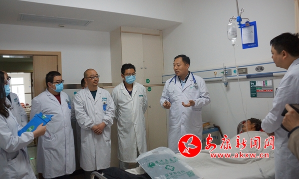 练学淦首先在镇坪县医院内科病区,以2名脑梗塞患者为例进行示范性教学查房,来到病房详细听取了主管医生的病例汇报。在凝神听取主管医生的汇报后,练主任在患者床旁同患者及家属交谈,并亲自进行查体,了解疾病发展过程中的每个细节,一丝不苟的从头查起。