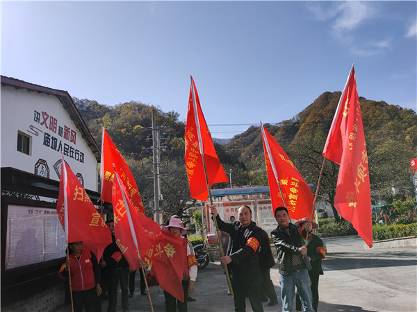 金秋时节,在上竹镇各村落,肩扛红旗的宣传队伍行走在乡间小路,为上竹镇平安建设工作忙碌着。