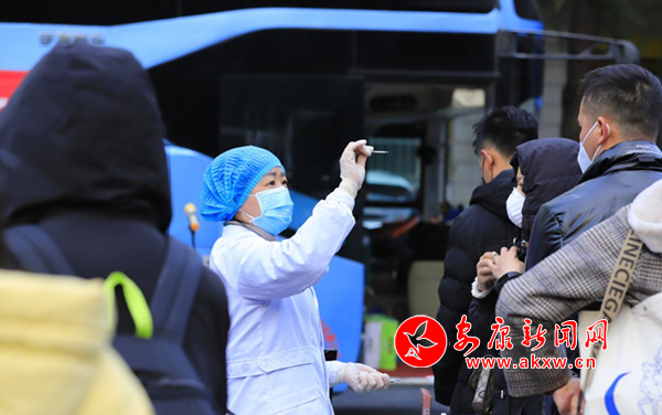 上午8点,带着行李、佩戴口罩的返岗人员们齐聚在县中心广场。在该县人社局工作人员的组织下,员工们有序地依次经过体温检测、身份核实、个人健康状况查验、安全检查,踏上返岗复工复业的旅程。