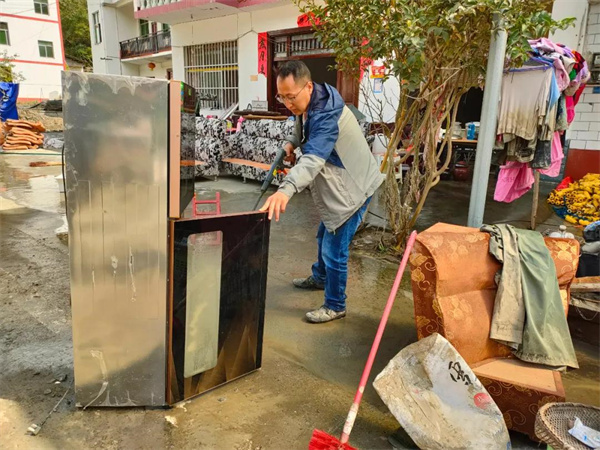 暴雨过后,留下了一片狼藉、满目疮痍的灾情现场。身心疲惫的温述钦一夜未眠,看到被洪水冲毁的道路和村庄,心里很不是滋味。因为连续转移撤离群众,温述钦的嗓子已经嘶哑,脚上磨出了几十个血泡,但他顾不上片刻休息,天刚微微亮就立即带领“四支队伍”分片排灾查灾,挨家挨户走访受灾群众,了解统计受灾情况。同时组织“四支队伍”、党员干部全力以赴抢修道路、恢复饮水和电力通讯,动员引导群众发扬自力更生精神,采取亲邻相帮、互帮互助的办法,积极开展生产生活自救,努力把灾害造成的损失降到最低。