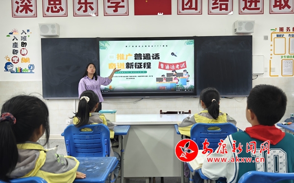 在课间,学校师生以具体形象、通俗易懂的语言,诠释了自己对普通话和规范简化字的认识。在主题班会上,各班借助PPT、宣教片等形式向学生科普了普通话的由来、普通话水平等级、不规范简化字、《通用语言文字法》的解读、文学名著中的偏僻字音等知识,号召大家“讲普通话,写规范字”,积极主动地弘扬民族语言文化。