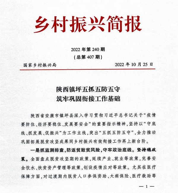 国家乡村振兴局简报2022年第240期刊发《陕西镇坪:五抓五防五守 筑牢巩固衔接基础》,全文如下: