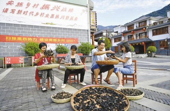 (七月三十一日, 在镇坪县联合村的巴山腊味小镇,村民杨大兵(右二)与家人正在清洗岩耳。巴山腊味小镇是陕西省十二个农村特色产业小镇之一,每年吸引不少省内外……