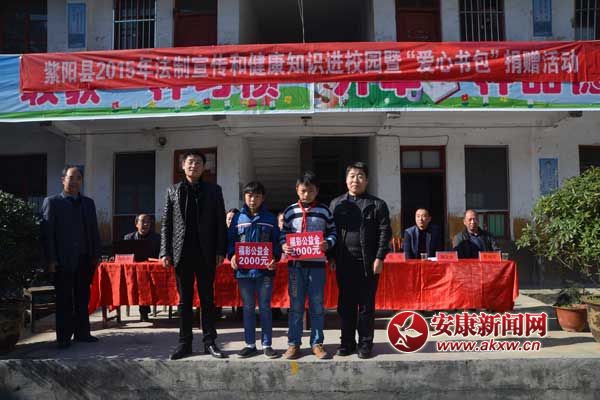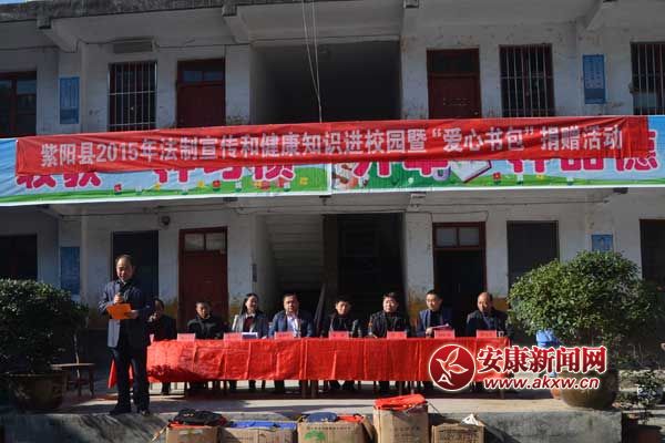 安康新闻网讯 (通讯员 肖宝) 在“12•4”国家宪法日暨全国法制宣传日即将到来之际,11月26日,由紫阳团县委举办的紫阳县2015年法制宣传和健康知识进校园暨“爱心书包”捐赠活动走进斑桃小河小学。活动现场,紫阳团县委为全校学生购买了价值1.5万元的爱心书包和手套,并及时发放到了每个学生的手中。