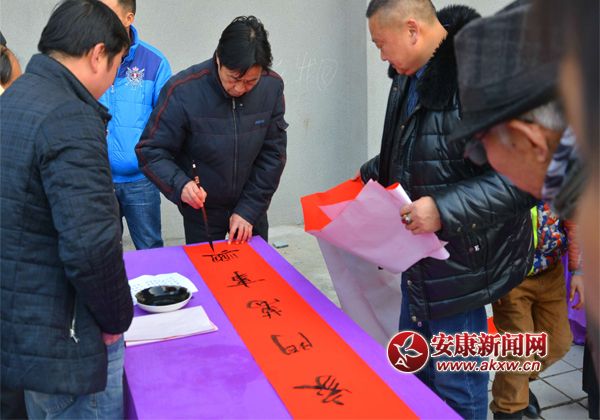 在广场入口处,4名中青年书作者正挥毫泼墨,为居民义写春联。“喜居宝地千年旺,福照家门万事兴”,一位社区居民从书画家赵刚华手中接过春联,小心翼翼地摊晾在平地上。据统计,当天共为居民书写春联300余副。