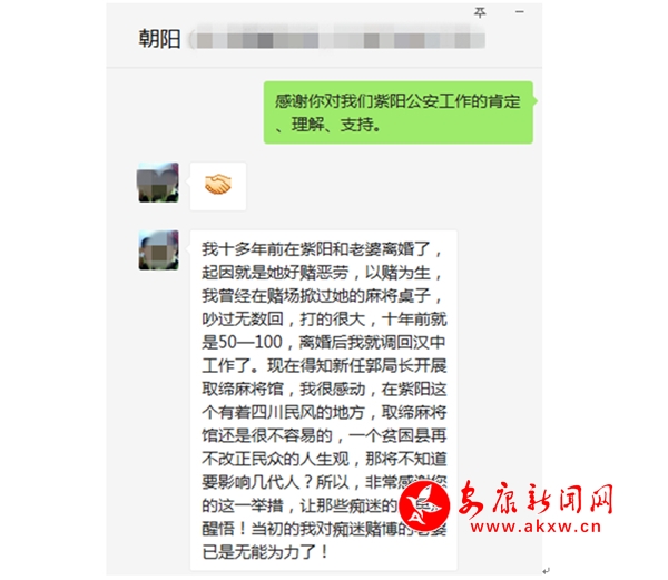 8月7日8时25分,紫阳县公安局新媒体中心接到电话号码为1589166****的汉中籍男士打来的电话,在电话里,该男士非常激动的对紫阳县公安局作出的开展贫困村麻将馆、棋牌室集中整治专项行动赞不绝口,该男士在电话里诉说:“我是汉中人,有正式工作,也是紫阳女婿,多年前和媳妇一起住在紫阳,紫阳是个好地方,但是,就是赌博之风太严重了,媳妇一度沉迷赌博,屡次劝说不听,一场牌局下来,少则输几千,多则输几万,几年下来,殷实的家庭四处举债,一度举步维艰,迫不得已,和媳妇离了婚,伤心之余,将工作调回了汉中。前几天,在网上看到了紫阳县公安局发出的禁赌通告,觉得非常好,要脱贫,就要先禁赌,特别感谢郭书记!这次禁赌行动,是给那些喜好赌博的人敲响了警钟,告诫那些沉迷赌博的人:应该把精力放在脱贫致富、建设美好家园上,沉迷赌博,害人害已。”