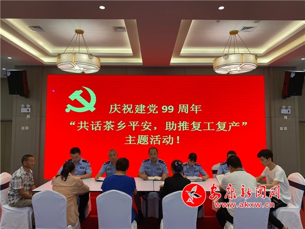 7月1日,向阳派出所党小组邀请珑玥茶山酒店、木鱼包茶厂、银河茶厂等企业负责人和员工,联合举行庆祝建党99周年“共话茶乡平安,助推复工复产”座谈会。