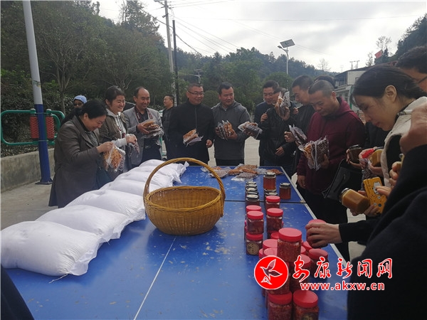 在黄金村驻村工作队组织下,20户贫困户把自家生产加工的土特产品运到村中心广场,广场上堆放着苦荞、土蜂蜜、土鸡蛋、包谷酒、干萝卜片、豆腐乳、黄豆酱和新鲜丹参等产品,帮扶干部踊跃购买,现场产品销售一空。活动共销售了20户贫困户11种农副产品,销售额达1.2万余元。