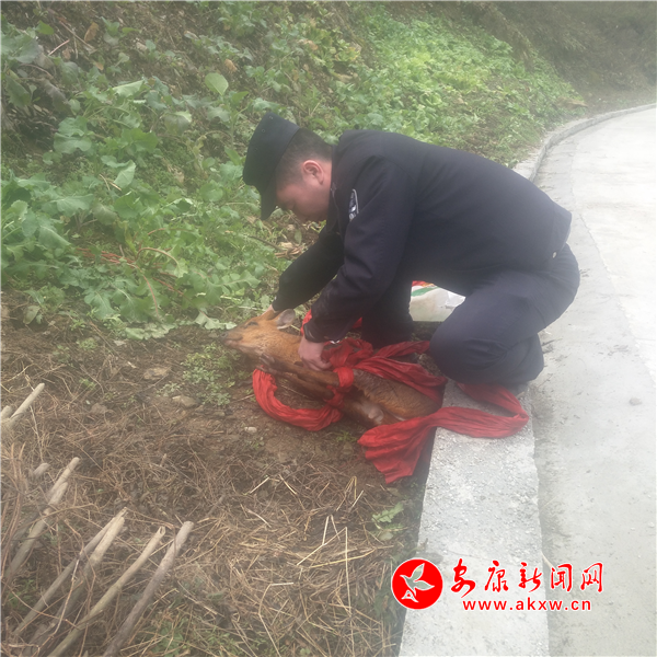 12月24日,早晨10点左右,双桥镇东河坝小区群众发现一只麂子被土狗追逐,麂子慌不择路,从悬崖上跳下河坝受伤。双桥派出所民警接到群众电话后,立即前往进行营救,将其捕救回所里。问迅赶来的农综站干部了解了麂子的健康状态后,在麂子恢复体力后,于下午14点30分和派出所的民警一起将麂子带到无人区放归山林。