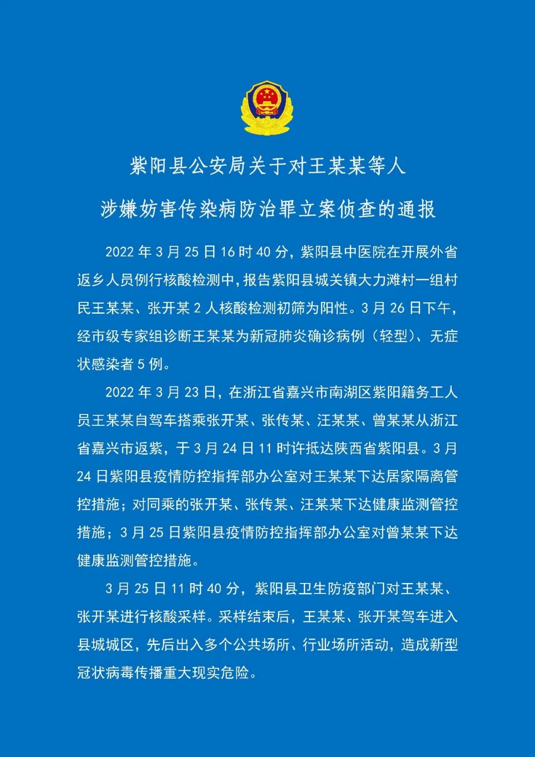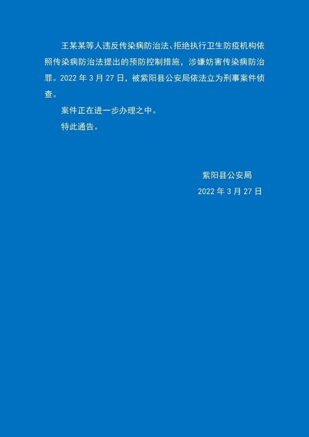 紫阳县公安局关于对王某某等人涉嫌妨害传染病防治罪立案侦查的通报